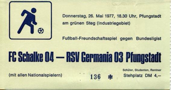 Als Datum für die Reinkarnation des in Blau und Weiß gehüllten Knüllers wird der 26. Mai 1977 (Christi Himmelfahrt respektive Vatertag) fixiert. Rucki Zucki versetzt die Fahndung nach Eintrittskarten ganz Südhessen in einen Hype. Bereits am ersten Tag des Vorverkaufs wandern 2000 Tickets über die Ladentheken. Mit Hilfe einer ad hoc errichteten Zusatztribüne stehen genauso viele Sitzplätze zur Verfügung, so dass insgesamt ca. viereinhalb Tausend Fans den Grünen Steg umzäunen. Der mythische Name „Schalke“, an dessen Strahlkraft kaum ein anderer nationaler Klub heranreicht, elektrisiert erneut die ansonsten beschauliche Modau-Metropole.